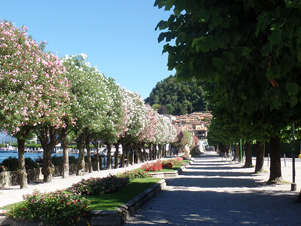As we explored the streets that run across the face of the hillside, we found numerous shops and restaurants even within the residential areas. Most advertised similar menus that feature lake fish, dried lake fish in pastas, and fish from many of the seas, although usually not using their geographic names. We wanted to get some exercise, having had a substantial meal the night before and started to follow signs for a castle on the top of the hillside. It was a forty minute walk, according to the signs. After about ten, we came to a graveyard, cut into the side of the hill. Fascinating visit to find this in a community where flat land is so precious. We looked at the time and decided we did not want to commit over two hours to the climb up so we walked back down into town and took the road out to the next community, Fiumalatta. We shared the road and a very narrow sidewalk along a substantial drop off to gardens or the lake below. From a distance the town appeared to look similar to Varenna, but when we arrived we did not find enough of interest to keep us there. So we walked back along the highway to the main square of Varenna.