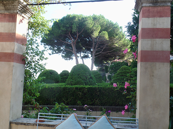 We decided to wander about a bit before getting ready for the wedding itself. Overlooking the harbor on a hilltop is the Cathedral of San Giacomo di Corte and Villa Durazzo, which appears to be an event center. We climbed up the long stairs to reach the top of the overlook. As we wandered through the immaculate gardens with tall palms and low hedges, painted stone walkways and cool breezes, we watched an event staff setting up chairs and tables. This was not the location of our event, but we had glimpsed another couple in gown and tux taking pictures earlier down near another cathedral, so we weren’t attending the only wedding in town this weekend.